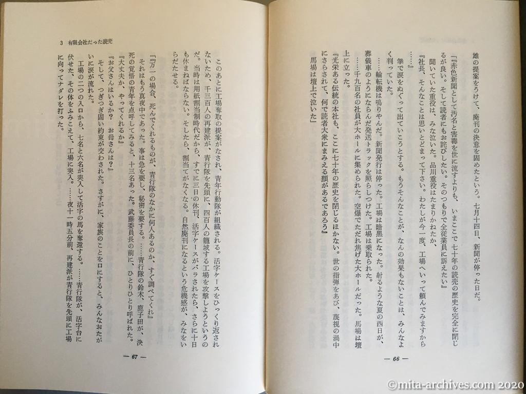 after-the-death-of-shoriki_039 ← 前へ 次へ → 正力松太郎の死の後にくるもの p.066-067 『赤色新聞として汚名と害毒を世に流すよりも、いまここで七十年の読売の歴史を完全に閉じるが良い。そして読者にもお詫びしたい。~世の指弾をあび、蔑視の渦中にさらされて、何で読者大衆にまみえる顔があるであろう』馬場は壇上で泣いた