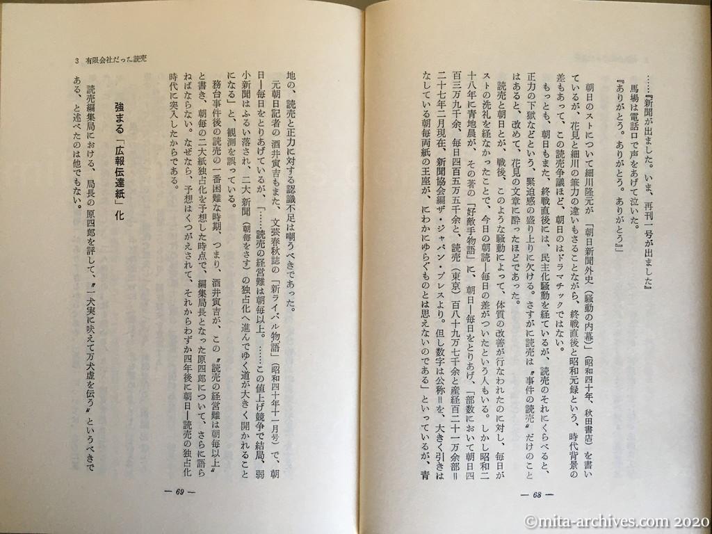 正力松太郎の死の後にくるもの p.068-069 青地晨が、朝日—毎日をとりあげ、「大きく引きはなしている朝毎両紙の王座が、にわかにゆらぐものとは思えないのである」といっているが、青地の、読売と正力に対する認識不足は嘲うべきであった。