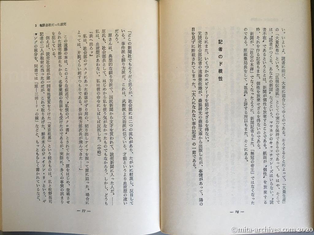 正力松太郎の死の後にくるもの p.076-077 『表へ出ろッ』私は、社会部のデスクにあった鉛筆けずり用の、切り出しナイフを握って原に迫った。場合によっては、片腕ぐらい刺すつもりである。景山地方部次長が飛んできた……