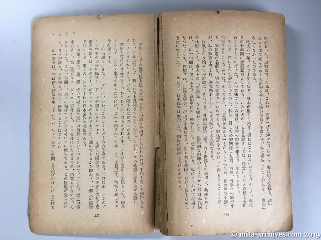 jeep-cametofetch_113 ← 前へ 次へ → 迎えにきたジープ p.216-217 Afterword (continued) That feeling of anxiety, confusion, and fear, whether the jeep is American or Soviet, is not the feeling of an individual, but the feeling of Japan as a whole sandwiched between the US and the Soviet Union.