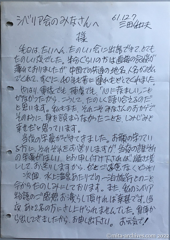 シベリヤ印象記(4)『シベリヤ印象記のはじめに④』 平成11年(1999)8月28日 画像は三田和夫の手紙原稿(シベリア会のみなさんへ1986.12.07)