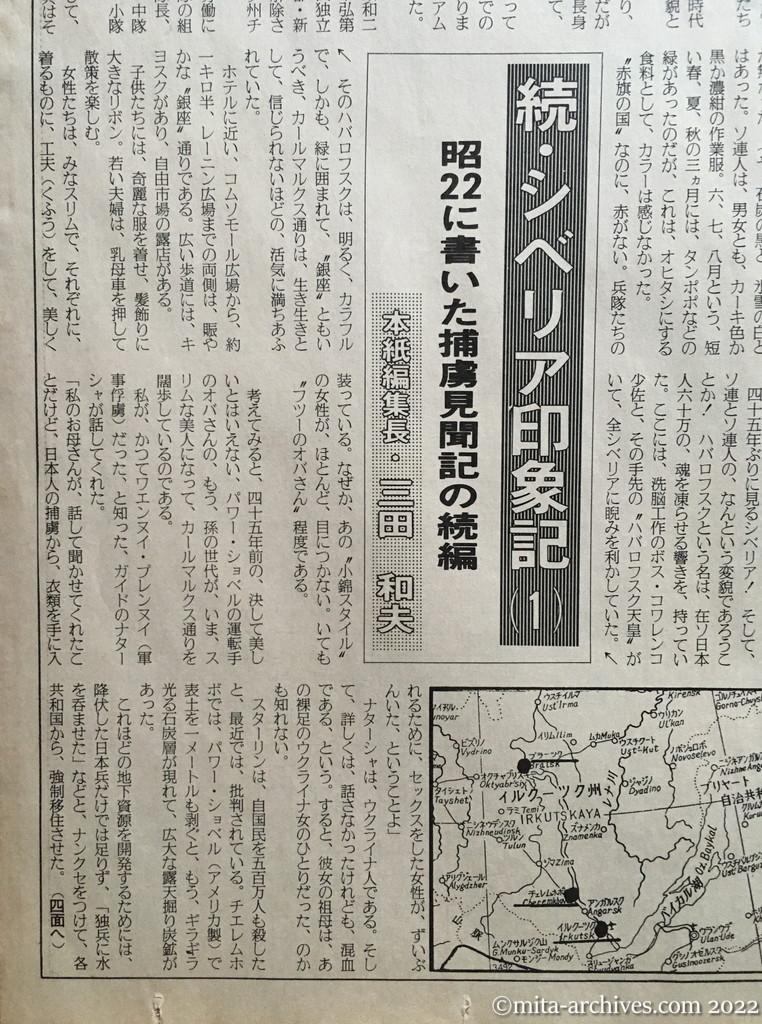 mitakazuo272 ← 前へ 次へ → 正論新聞 第587号 平成2年9月1日・11日合併号 第3面 45年振りのシベリアは、明るく、活気に満ちていた! あの暗い、沈んだシベリアは、どこにいったのだ? ペレストロイカは極北の地にも… 続・シベリア印象記(1) 昭22に書いた捕虜見聞記の続編 本紙編集長・三田和夫 ハバロフスク イルクーツク ブラーツク