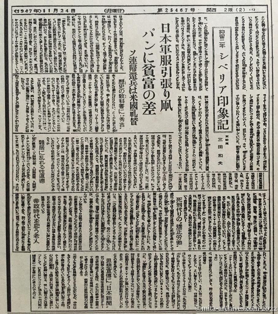 読売新聞 昭和22年(1947年)11月24日 第2面 抑留二年 シベリア印象記 本社員 三田和夫 日本軍服引張り凧 パンに貧富の差 ソ連帰還兵は米国礼賛
