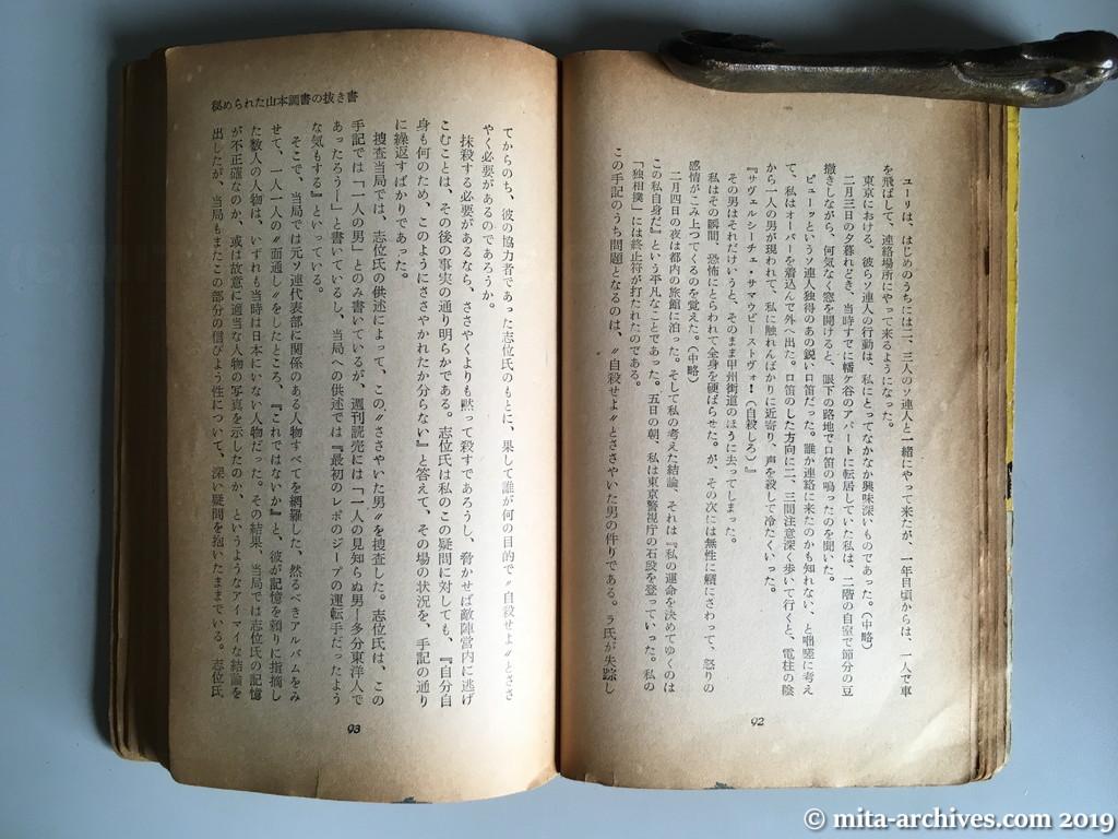 red-kasumigaseki_053 ← 前へ 次へ → 赤い広場ー霞ヶ関 p.092-093 A man appeared, killed his voice and said coldly. “Совершаете самоубийством!(Commit suicide!)” 一人の男が現れて、声を殺して冷たく言った。「совершаете самоубийством!(自殺しろ)」