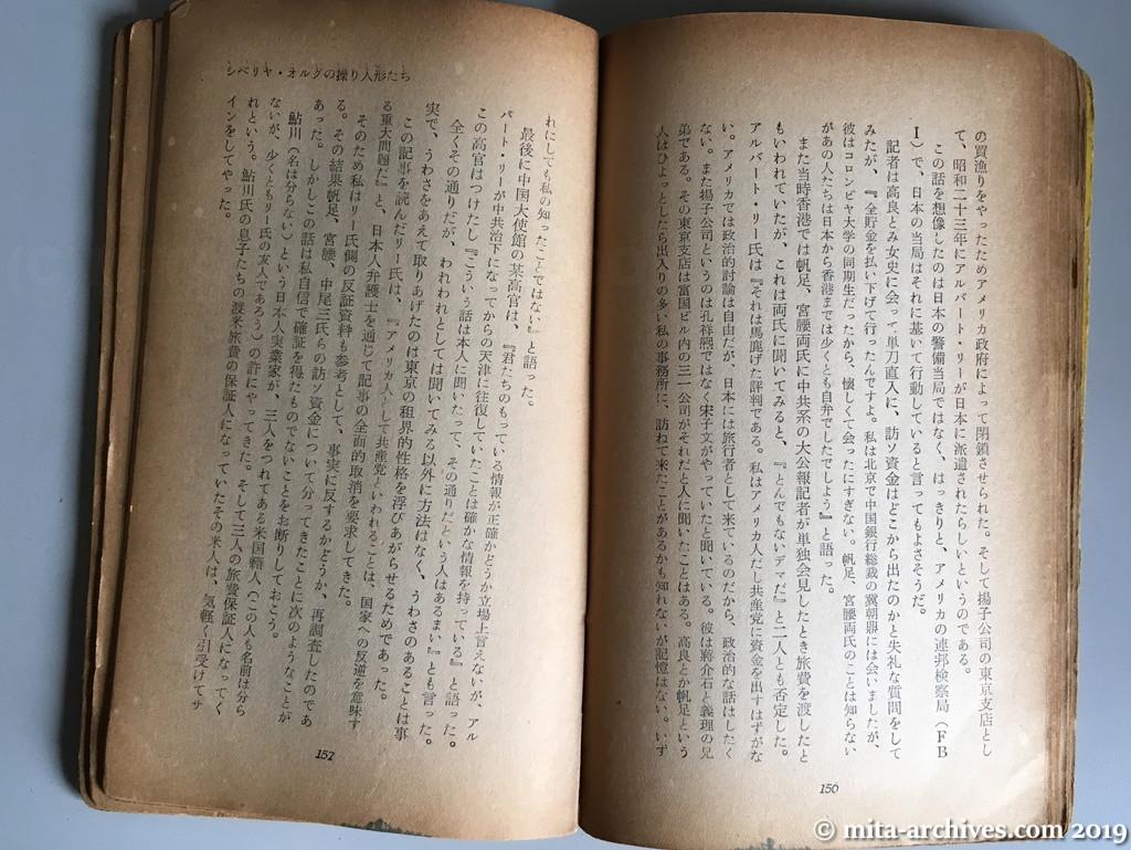 red-kasumigaseki_085 ← 前へ 次へ → 赤い広場ー霞ヶ関 p.156-157 I tried to hear the facts from Tomi Kora, Kei Hoashi, Kisuke Miyakoshi, and Albert Lee, but all denied. A senior Chinese embassy said, “If you ask him, no one will admit it.” 高良とみ、帆足計、宮腰喜助、アルバート・リー、それぞれ本人に事実を質したが、全員とも否定した。中国大使館高官は『本人に聞いたって、その通りだという人はあるまい』と言った。
