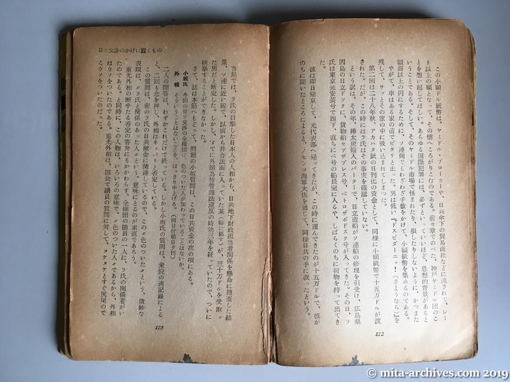 赤い広場ー霞ヶ関 p.172-173 Foreign Minister Shigemitsu denied the fact that there was a person who belonged to Rastvorov, the Soviet spy, in the delegation with full authority of negotiations between Japan and the Soviet Union.