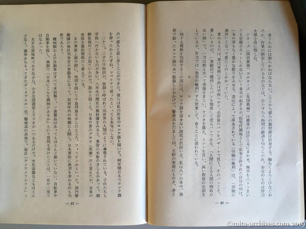 the-last-scoop-reporter_046 ← 前へ 次へ → 最後の事件記者 p.080-081 富めるものは、妻は家庭に子供は学校へやり、必要量のパンをバザールで買う。そのパンこそ、貧しいものが、一家総出で獲得したパンを割愛して売るパンである。