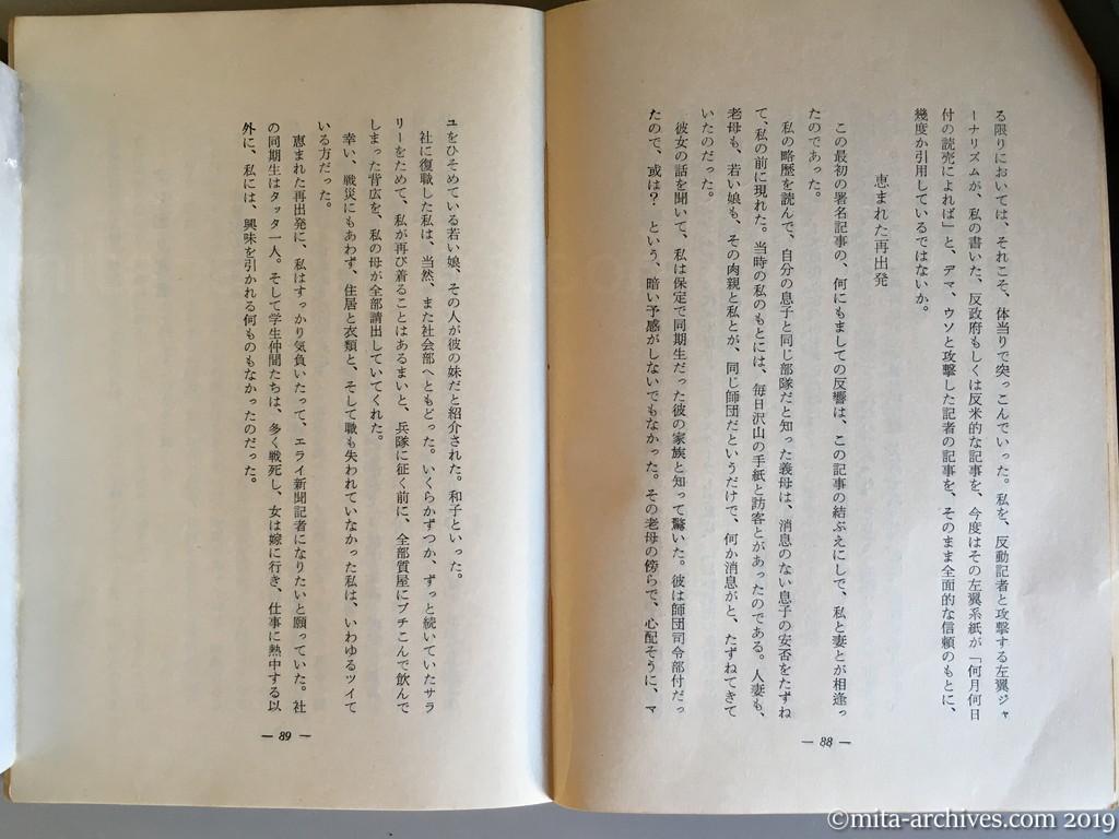 the-last-scoop-reporter_050 ← 前へ 次へ → 最後の事件記者 p.088-089 彼女の話を聞いて、私は保定で同期生だった彼の家族と知って驚いた。彼は師団司令部付だったので、或は? という、暗い予感がしないでもなかった。