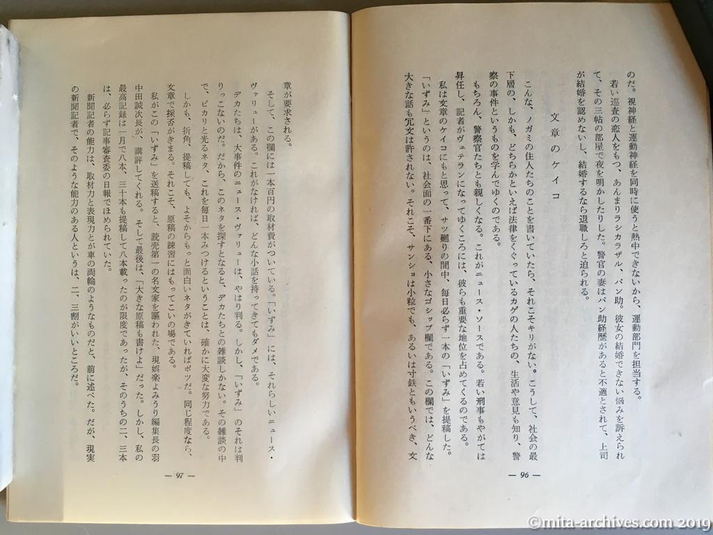 the-last-scoop-reporter_054 ← 前へ 次へ → 最後の事件記者 p.096-097 読売第一の名文家を謳われた、現娯楽よみうり編集長の羽中田誠次長が、講評してくれる。私の最高記録は一月で八本、三十本も提稿して八本載ったのが限度であった