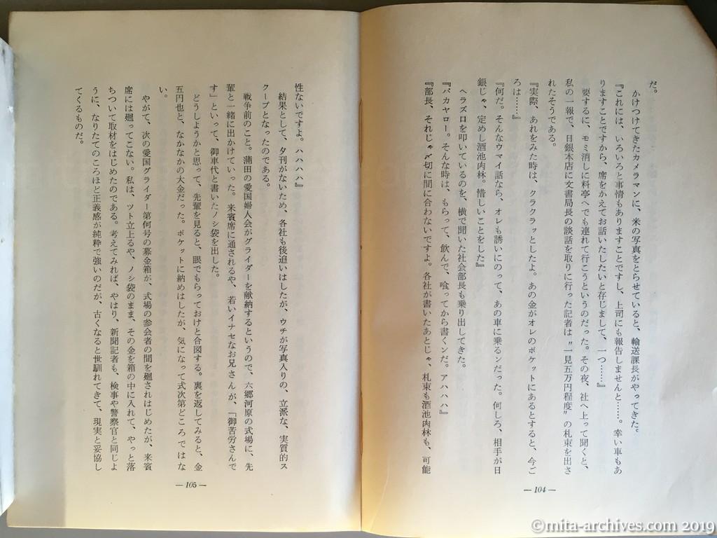 the-last-scoop-reporter_058 ← 前へ 次へ → 最後の事件記者 p.104-105 横で聞いた社会部長も乗り出してきた。『バカヤロー。そんな時は、もらって、飲んで、喰ってから書くンだ。アハハハ』