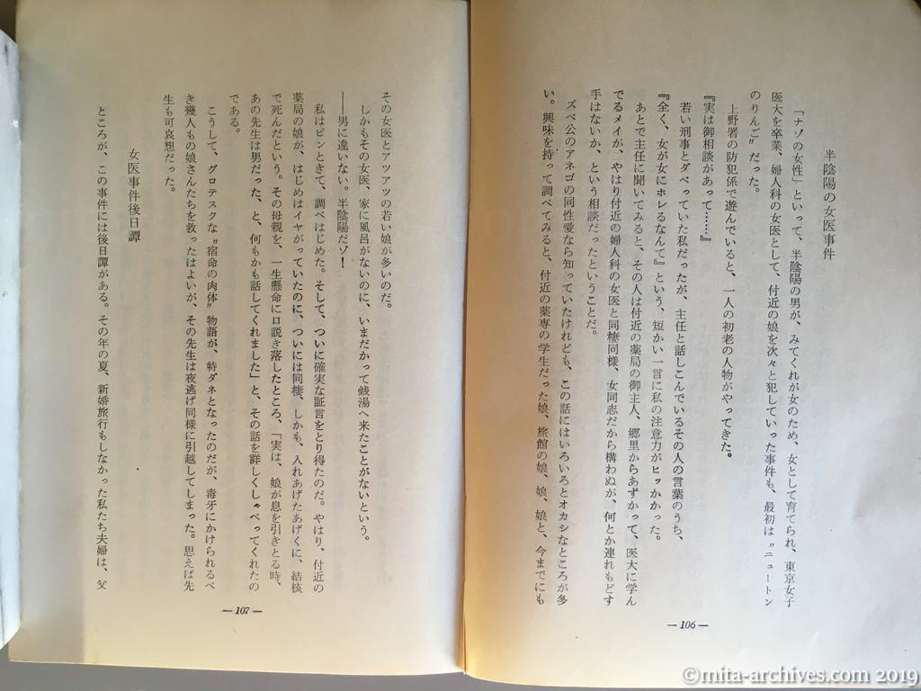 最後の事件記者 p.106-107 郷里からあずかって、医大に学んでるメイが、やはり付近の婦人科の女医と同棲同様、女同志だから構わぬが、何とか連れもどす手はないか…