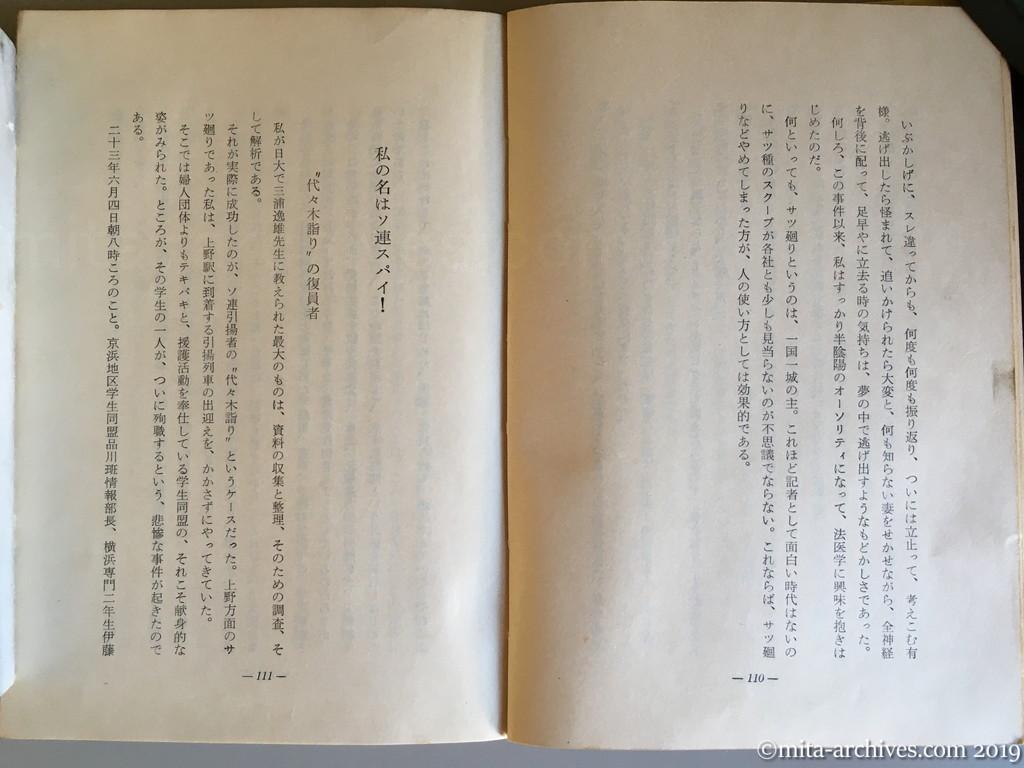 the-last-scoop-reporter_061 ← 前へ 次へ → 最後の事件記者 p.110-111 私が日大で三浦逸雄先生に教えられた最大のものは、資料の収集と整理、そのための調査、そして解析である。