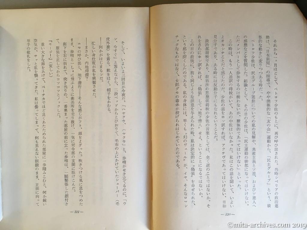 the-last-scoop-reporter_066 ← 前へ 次へ → 最後の事件記者 p.120-121 少佐の話をホン訳すれば、アクチヴであってはいけない、日和見分子であり、ある時には反動分子にもなれということだ。