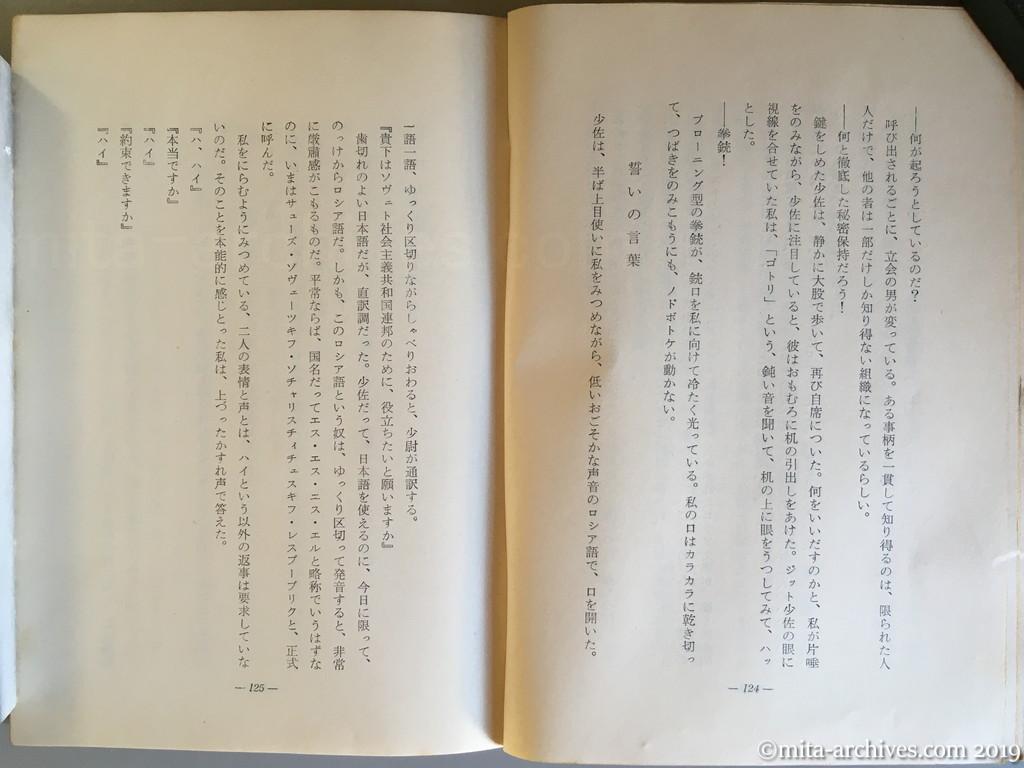 the-last-scoop-reporter_068 ← 前へ 次へ → 最後の事件記者 p.124-125 ブローニング型の拳銃が、銃口を私に向けて冷たく光っている。私の口はカラカラに乾き切って、つばきをのみこもうにも、ノドボトケが動かない。