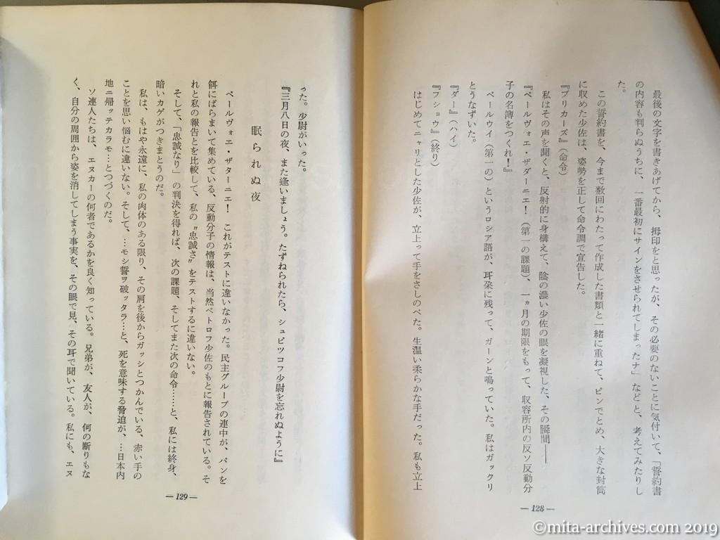 the-last-scoop-reporter_070 ← 前へ 次へ → 最後の事件記者 p.128-129 陰の濃い少佐の眼を凝視した、その瞬間——『ペールヴォエ・ザダーニエ!(第一の課題)、一ヵ月の期限をもって、収容所内の反ソ反動分子の名簿をつくれ!』