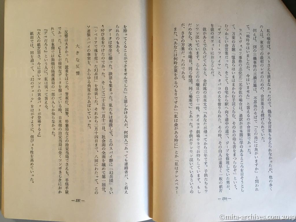 the-last-scoop-reporter_074 ← 前へ 次へ → 最後の事件記者 p.136-137 データは完全に揃った。談話も集まった。私たちは相談して、このスパイ群に「幻兵団」という呼び名をつけたのであった。