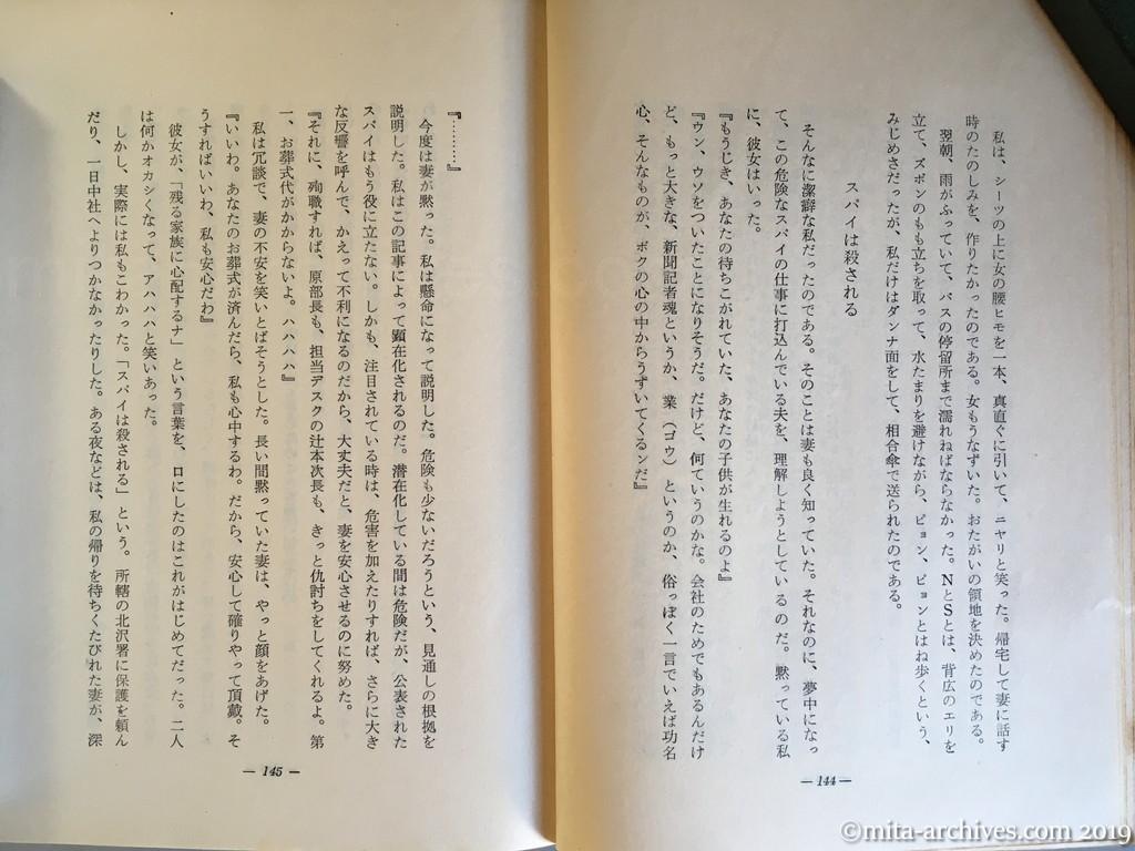 the-last-scoop-reporter_078 ← 前へ 次へ → 最後の事件記者 p.144-145 『それに、殉職すれば、原部長も、担当デスクの辻本次長も、きっと仇討ちをしてくれるよ。第一、お葬式代がかからないよ。ハハハハ』