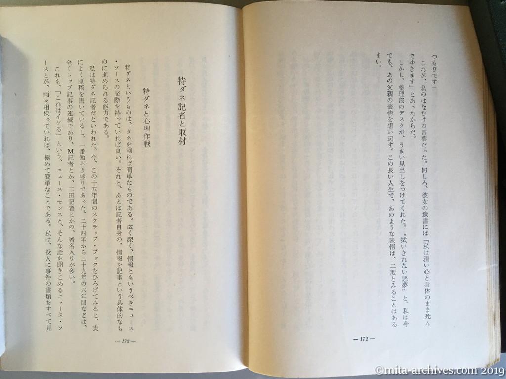 最後の事件記者 p.172-173 私は特ダネ記者だといわれた。二十四年から二十九年の六年間などは、全くトップ記事の連続であり、M記者とか、三田記者とかの、署名入りが多い。