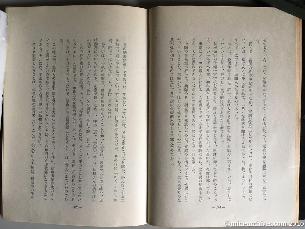 最後の事件記者 p.174-175 私はそこで一計を策した。兵隊の身上調査書を熟読したのだ。家庭の事情がどうで、性格はどうだ、ということを、三晩かかってほとんど覚えてしまったのである。