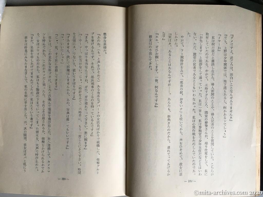 最後の事件記者 p.184-185 『あのね。(もっと声をひそめて)ある有名なデパートの女店員ばかりで組織した、売春グループを挙げるんです。それで、部長刑事のくるのを待っているんですよ』
