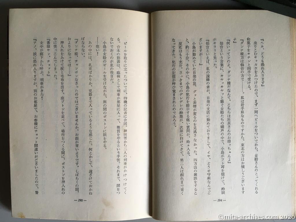 the-last-scoop-reporter_103 ← 前へ 次へ → 最後の事件記者 p.194-195 仙台という言葉に、キャッキャッと騒ぐ女給たちの嬌声の中で、小島がフト耳を傾けて、酔眼がキラリと光った。小島が勤めていた日発の話、グッと表情が変るのを見逃さなかった。