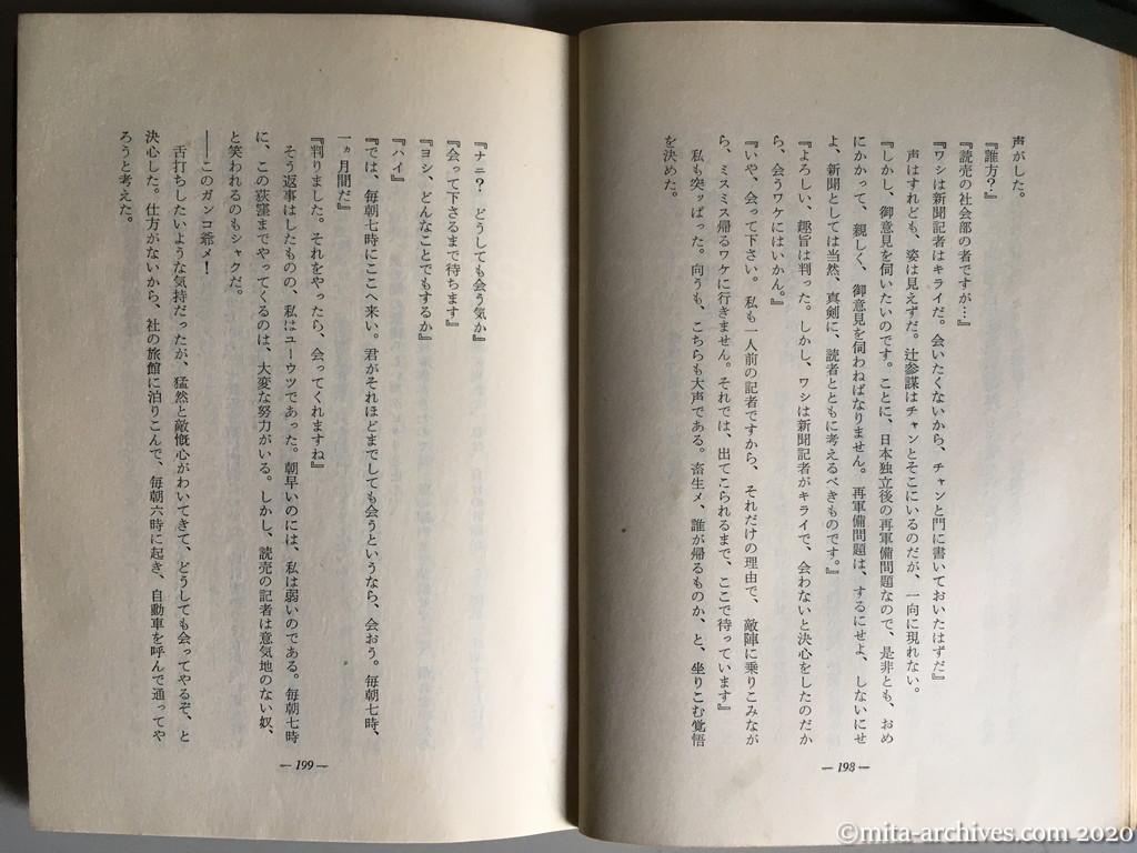 the-last-scoop-reporter_105 ← 前へ 次へ → 最後の事件記者 p.198-199 『ワシは新聞記者はキライだ。会いたくない』声はすれども、姿は見えずだ。辻参謀はチャンとそこにいるのだが、一向に現れない。 『ワシは新聞記者はキライだ。会いたくない』 声はすれども、姿は見えずだ。辻参謀はチャンとそこにいるのだが、一向に現れない。