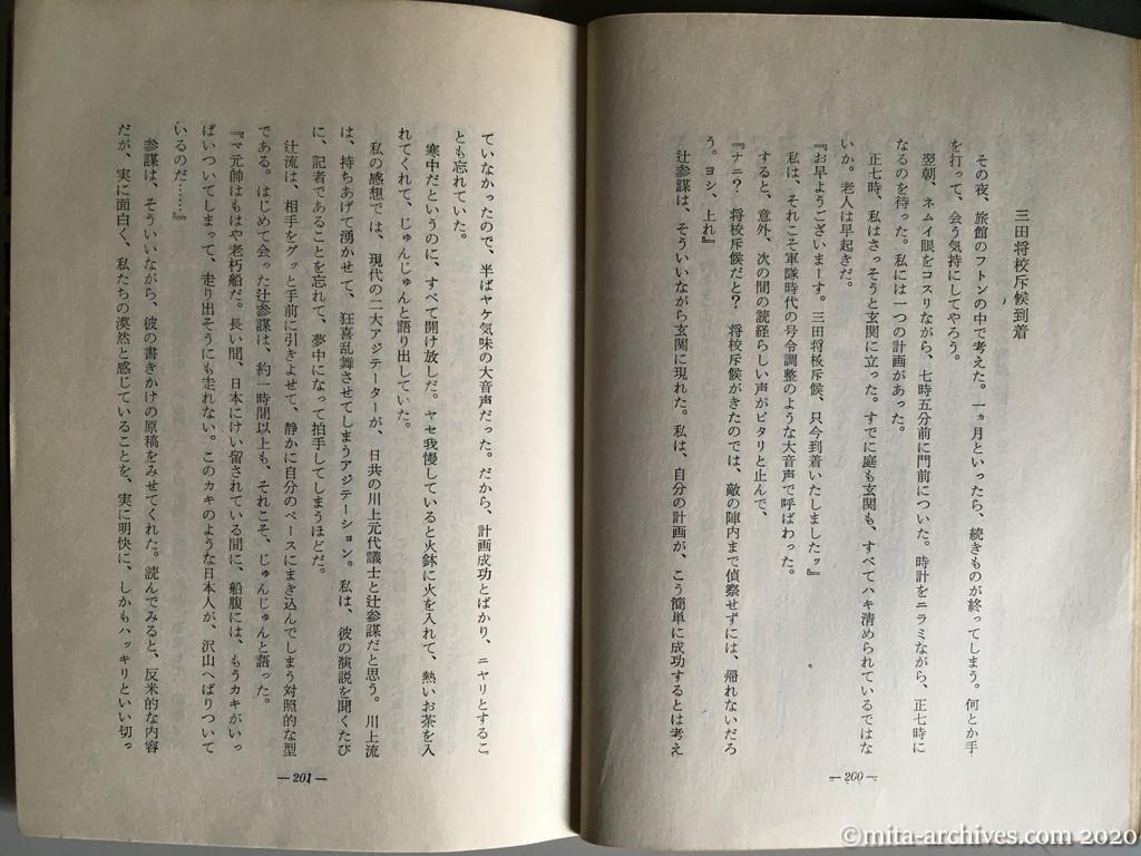 最後の事件記者 p.200-201 私の感想では、現代の二大アジテーターが、日共の川上元代議士と辻参謀だと思う。はじめて会った辻参謀は、約一時間以上も、それこそ、じゅんじゅんと語った。