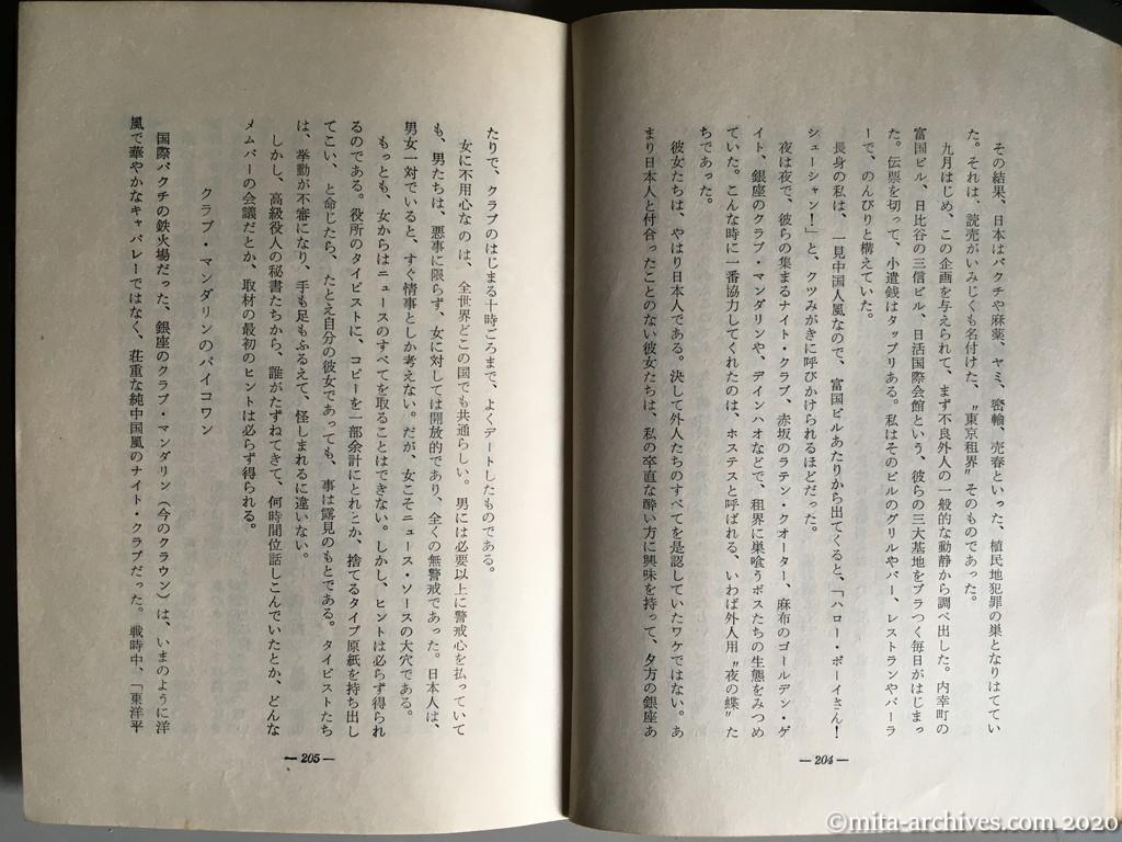 the-last-scoop-reporter_108 ← 前へ 次へ → 最後の事件記者 p.204-205 夜は夜で、彼らの集まるナイト・クラブ、赤坂のラテン・クオーター、麻布のゴールデン・ゲイト、銀座のクラブ・マンダリンや、デインハオなどで、租界に巣喰うボスたちの生態をみつめていた。 夜は夜で、彼らの集まるナイト・クラブ、赤坂のラテン・クオーター、麻布のゴールデン・ゲイト、銀座のクラブ・マンダリンや、デインハオなどで、租界に巣喰うボスたちの生態をみつめていた。