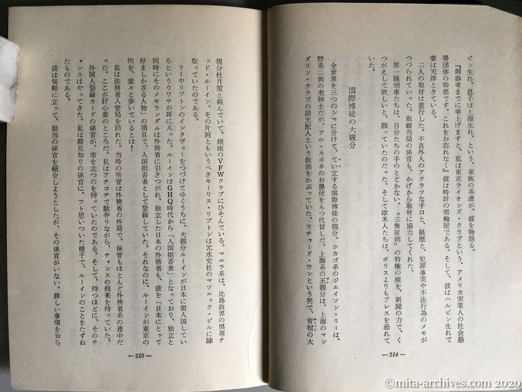 the-last-scoop-reporter_113 ← 前へ 次へ → 最後の事件記者 p.214-215 大親分ルーインが日本に密入国しているというウワサが耳に入った。日本の外務省も、彼を「日本にとって好ましかざる人物」の項目で、入国拒否者として登録していた。 大親分ルーインが日本に密入国しているというウワサが耳に入った。日本の外務省も、彼を「日本にとって好ましかざる人物」の項目で、入国拒否者として登録していた。
