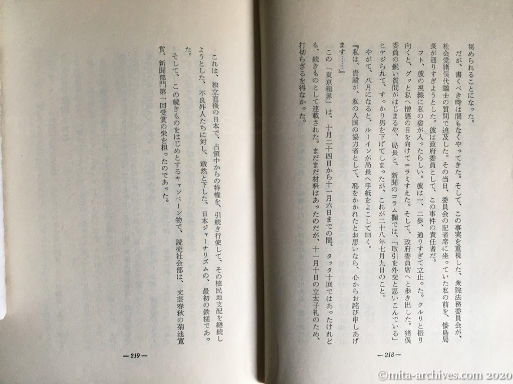 最後の事件記者 p.218-219 これは、独立直後の日本で、占領中からの特権を行使して支配を継続しようとした、不良外人たちに対し、敢然と下した、日本ジャーナリズムの、最初の鉄槌であった。