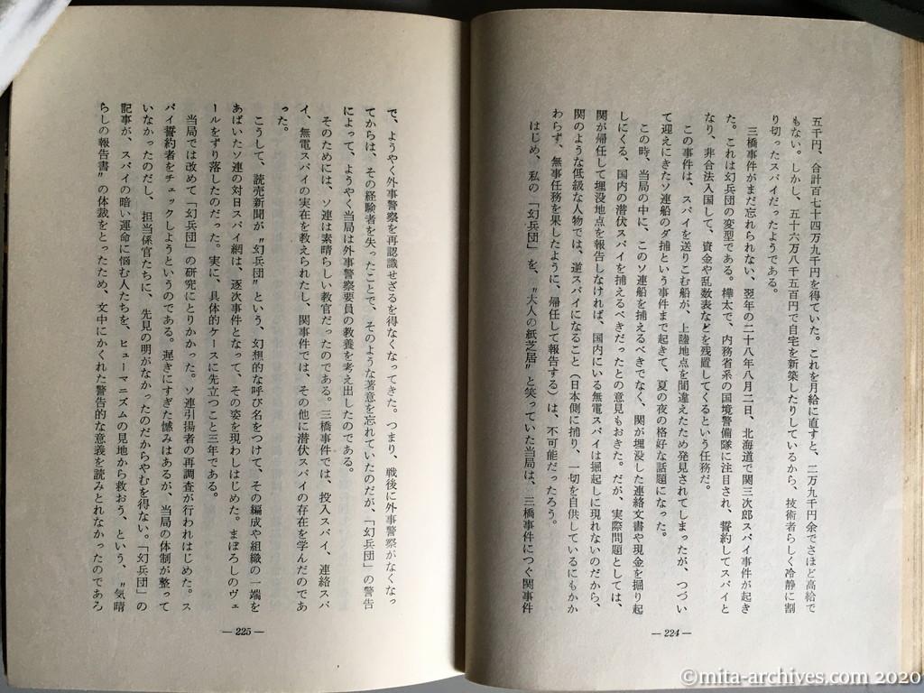 the-last-scoop-reporter_118 ← 前へ 次へ → 最後の事件記者 p.224-225 読売新聞が〝幻兵団〟という、幻想的な呼び名をつけて、その編成や組織の一端をあばいたソ連の対日スパイ網は、逐次事件となって、その姿を現わしはじめた。