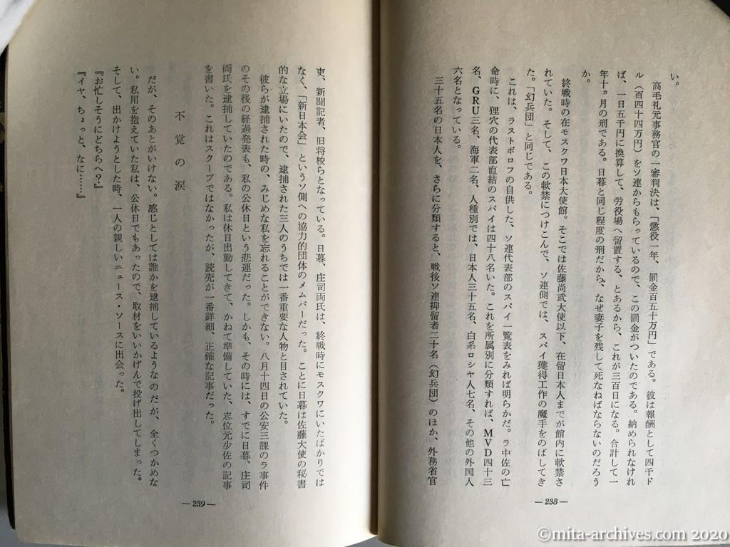the-last-scoop-reporter_125 ← 前へ 次へ → 最後の事件記者 p.238-239 日暮、庄司両氏は、「新日本会」というソ側への協力的団体のメムバーだった。ことに日暮は佐藤大使の秘書的な立場にいたので、一番重要な人物と目されていた。