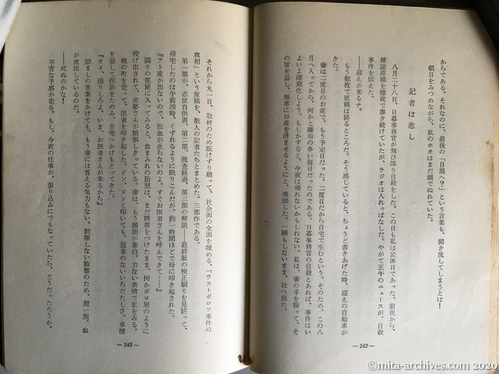 最後の事件記者 p.242-243 妻は、もう顔面が蒼白、力ない表情で私をみる。暁の町を走って、医者を叩き起した。ドン、ドンと叩いても、返事のないいらだたしさ。——死ぬのかな! 不吉な予感が走る。