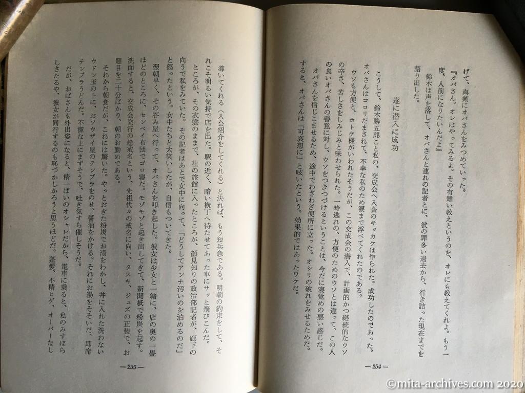 最後の事件記者 p.254-255 ウソも方便と、ホトケ様がいわれたそうだが、この交成会の潜入で、計画的かつ継続的なウソの辛さ、苦しさをしみじみと味わわされた。