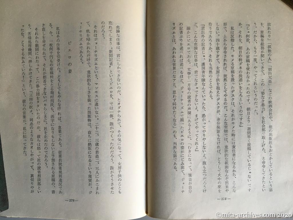 the-last-scoop-reporter_145 ← 前へ 次へ → 最後の事件記者 p.278-279 数回にわたって、この暴力団をタタいたのだが、彼らは怒って社へ押しかけてきた。「三田の奴メ、同志のようなカオしやがって、裏切りやがったな。どうするかみていろ!」 数回にわたって、この暴力団をタタいたのだが、彼らは怒って社へ押しかけてきた。「三田の奴メ、同志のようなカオしやがって、裏切りやがったな。どうするかみていろ!」