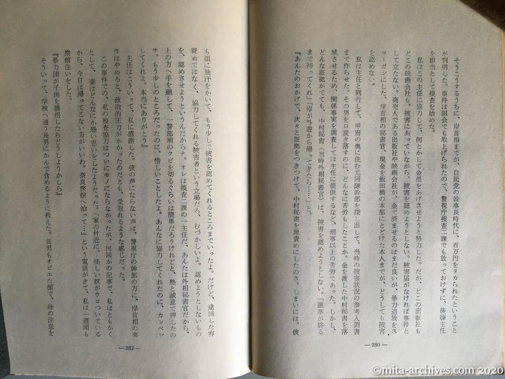 the-last-scoop-reporter_146 ← 前へ 次へ → 最後の事件記者 p.280-281 妻はどんなにか恐い思いをしたようだった。『暴力団が子供を誘拐したらどうしようかしら』そういって、学校へ通う長男にかんで含めるように教えた。