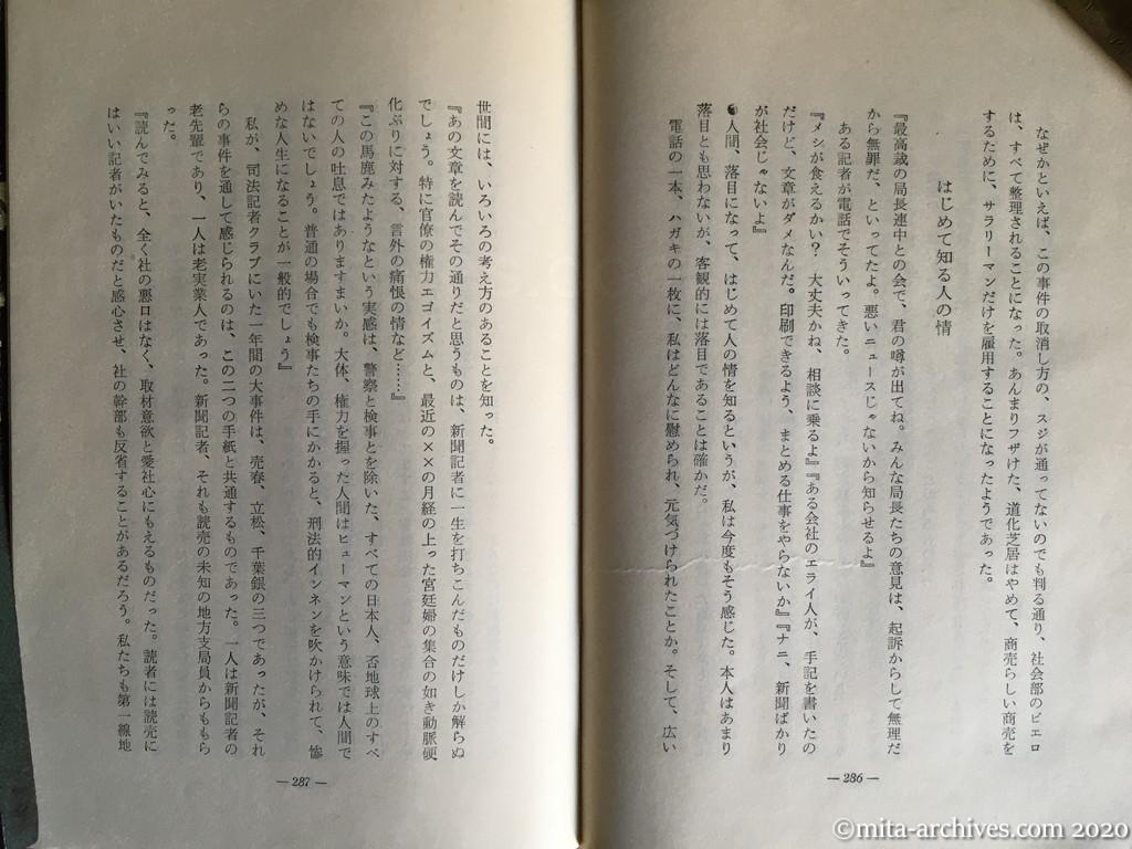 the-last-scoop-reporter_149 ← 前へ 次へ → 最後の事件記者 p.286-287 人間、落目になって、はじめて人の情を知るというが、私は今度もそう感じた。本人はあまり落目とも思わないが、客観的には落目であることは確かだ。