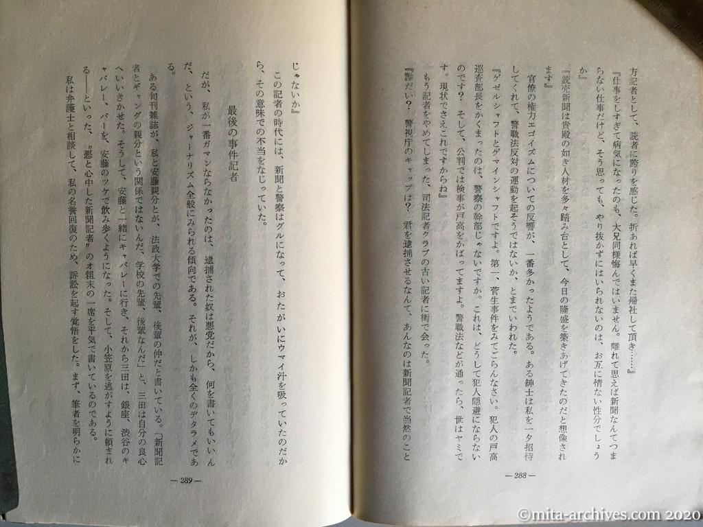 the-last-scoop-reporter_150 ← 前へ 次へ → 最後の事件記者 p.288-289 私が一番ガマンならなかったのは、逮捕された奴は悪党だから、何を書いてもいいんだ、という、ジャーナリズム全般にみられる傾向である。 私が一番ガマンならなかったのは、逮捕された奴は悪党だから、何を書いてもいいんだ、という、ジャーナリズム全般にみられる傾向である。