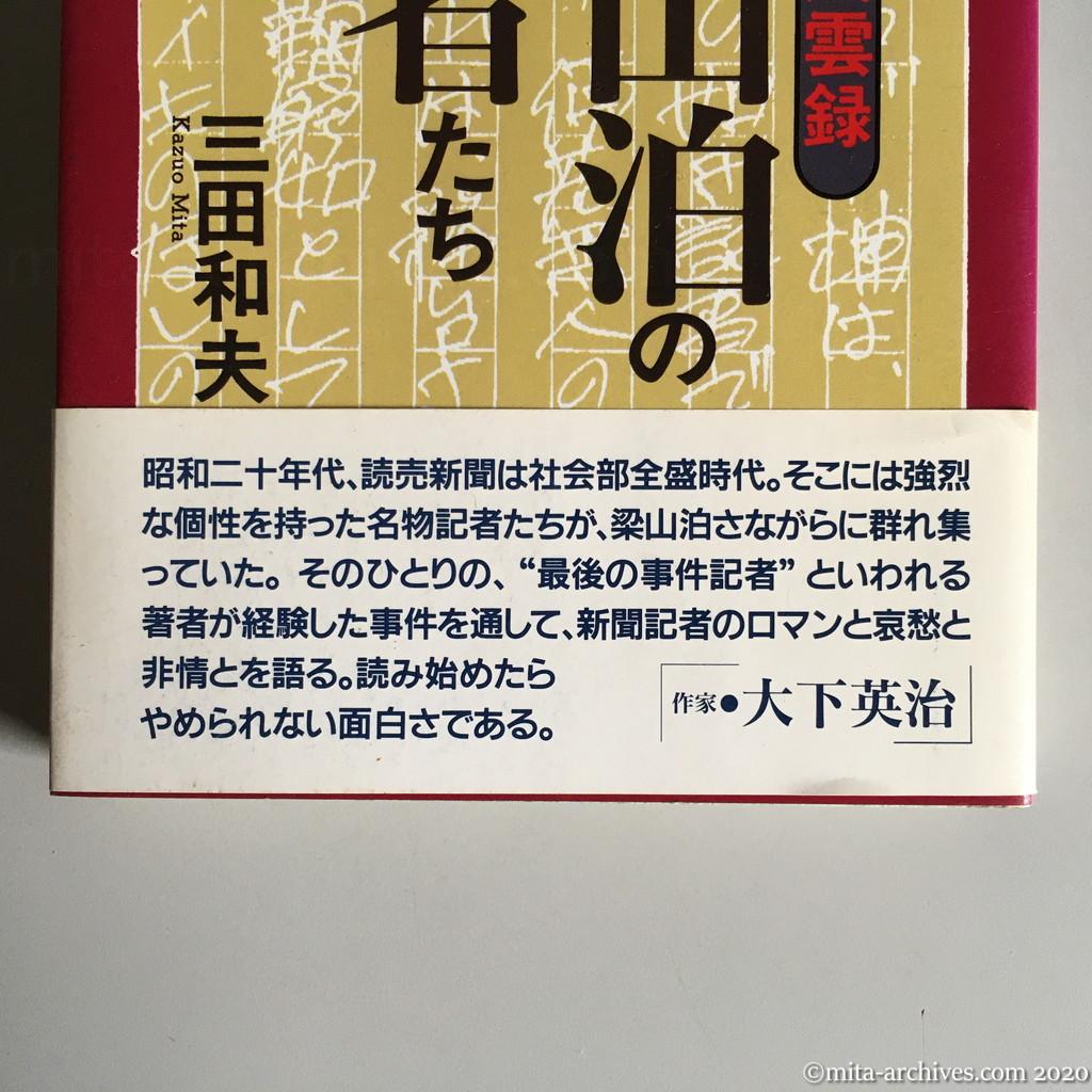 読売梁山泊の記者たち 腰巻 作家・大下英治「昭和二十年代、読売新聞は社会部全盛時代。そこには強烈な個性を持った名物記者たちが、梁山泊さながらに群れ集っていた。そのひとりの、〝最後の事件記者〟といわれる著者が経験した事件を通して、新聞記者のロマンと哀愁と非情とを語る。読み始めたらやめられない面白さである。」